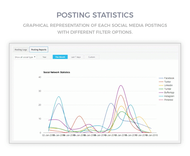 A log is required to document each success and failure. The Social Auto Poster plugin provides a page where all of your posting logs are displayed, with post title and link, posting execution time, and post preview with social network post link, allowing you to simply check the published post from the logs. Posting reports also generates a pie chart depending on the social networks chosen, which can be adjusted by year, month, and days, as well as a custom period.